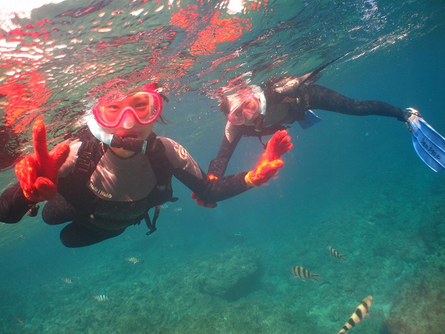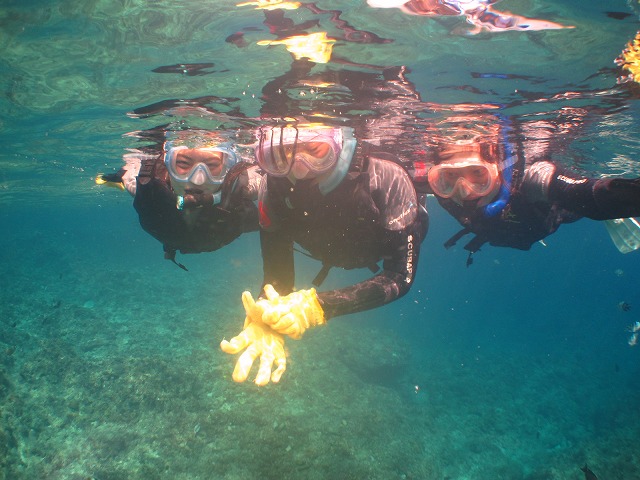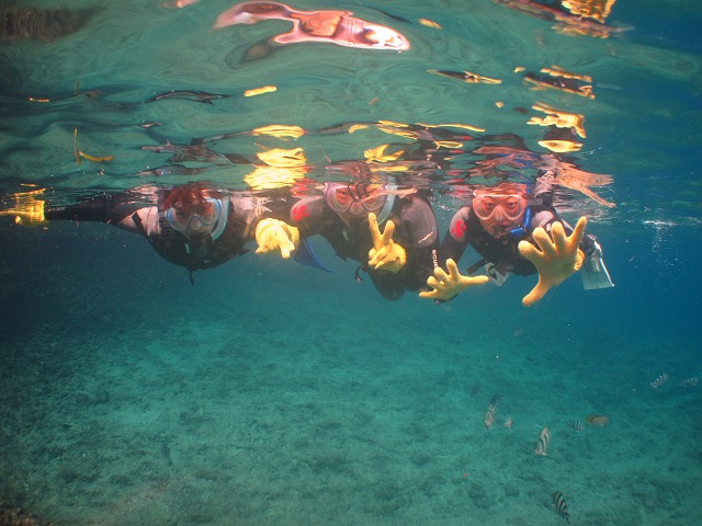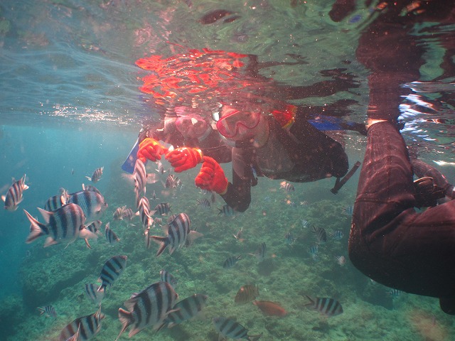 当社のシュノーケリングツアーは小さなお子様からご年配の方までご参加頂けるように足の着く浅場から開催できるよう構成していますので2歳のお子様でも安心してご参加頂けるようになっております^^今回も足の着く浅場でしっかり練習してツアー開始です。泳げない方もいらっしゃいましたが5分間ほど練習したらスイスイと泳いでいましたね^^