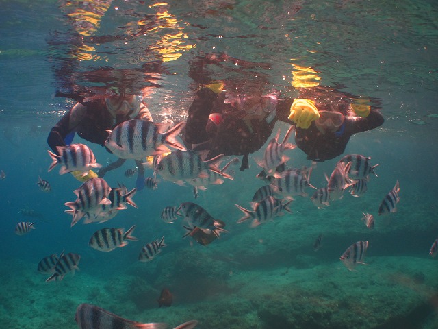 ロクセンスズメダイやなどのカラフルなお魚が目の前に集まってきていますね!!