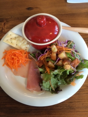 生ハムとスープとサラダとクラッカーとアイスコーヒーもついてます
