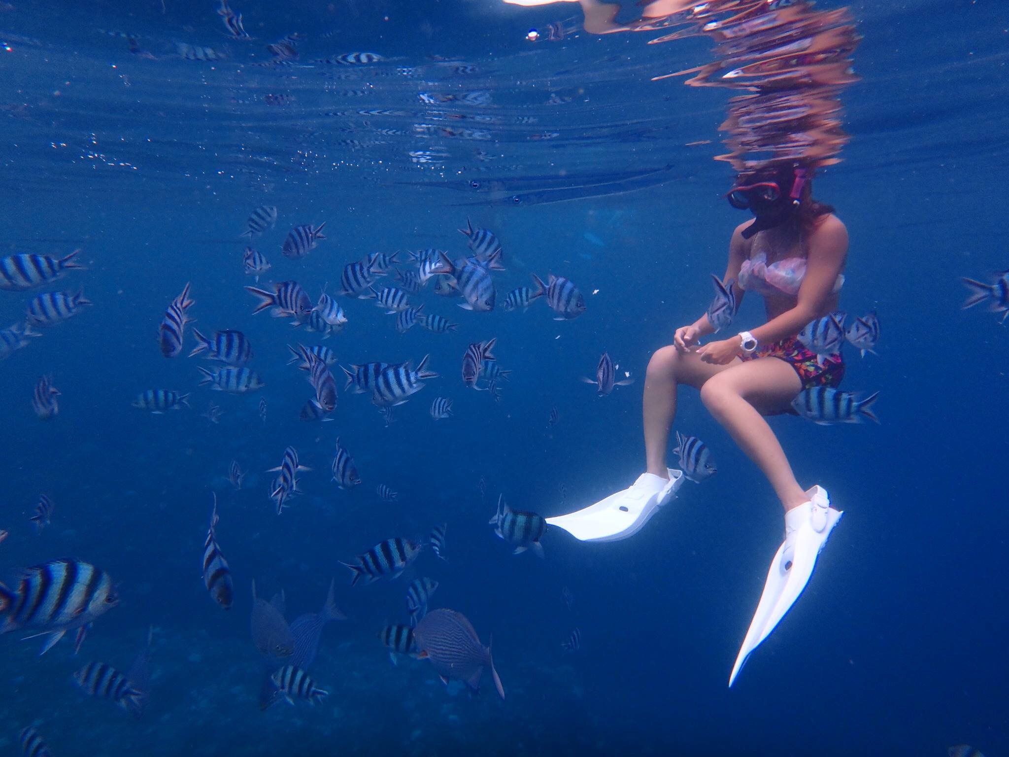 この日は海で遊び、いつもお客さんをシュノーケルに連れて行くときみたいに、魚の紹介してました。