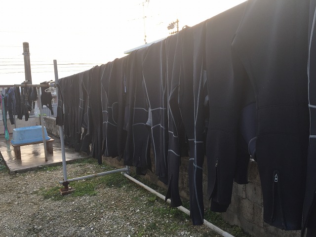 ショップに帰ってきてから後片付けをして、干してあるウエットスーツがびっしり・・・