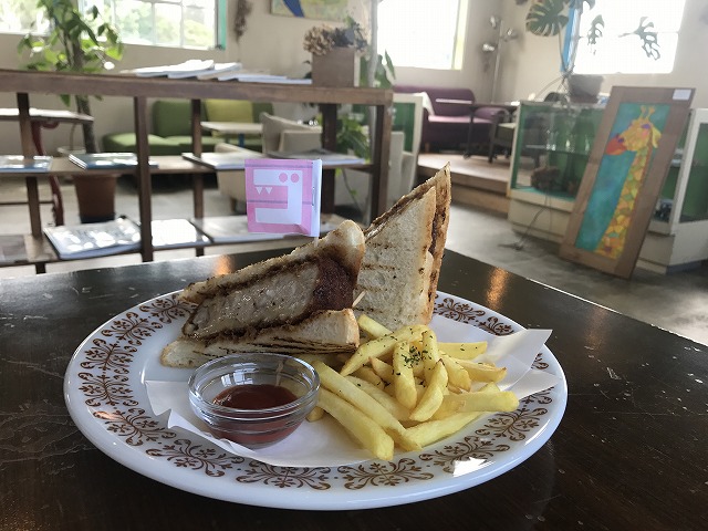残波岬を出て、真栄田岬の展望台に向かいましたが、真栄田岬に着いて色んな人とおしゃべりしていたら展望台に行くのを忘れてしまい、結局そのまま近くのカツサンドで有名なカフェ「GOZZA(ゴッサ)」」に行ってきました!(笑)