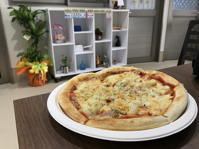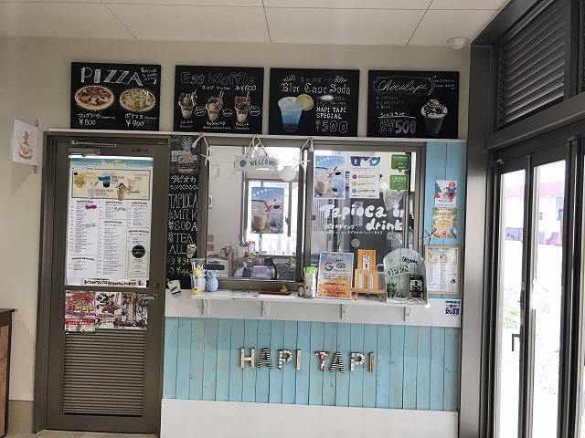 ゆんた市場の隣の建物には飲食店が沢山あり、入り口付近のHAPITAPIというお店の看板に青の洞窟ソーダと書いてあったので思わず脚を止め、お腹も空いていたのでおいしそうなピザと一緒に即買いしました!