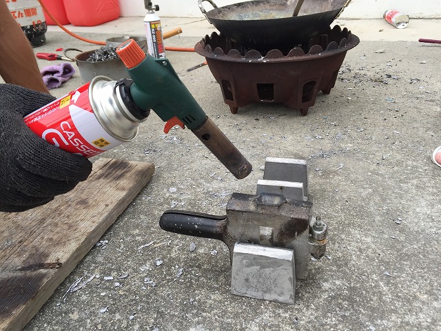 型に流し込む前に、バーナーを使って型を暖めています。