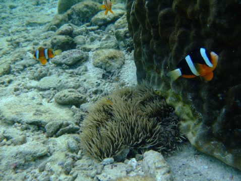 こちらの写真は、つい最近新たな家族が一人増えたクマノミの家族の写真です!五匹いるのですが、全部見つけられますか?一番小さいには奥の方で泳いでいます。